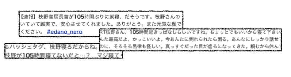 2011 年 3 月 11 日から今日に至るまで、日本では東日本大震災に関するツイート(つぶやき)が絶えることなく Twitter に投稿され続けている。地震や津波が発生した直後には、1 秒間のツイートが 5000 件以上になったことが 5 回もあった。その後も被災地にいる知り合いの安否情報などを求めるツイートが止まず、日本からツイート数は平常時の 500 %に増えた(参考:Twitter公式ブログ「東日本大地震における地球規模の情報の流れ」)。